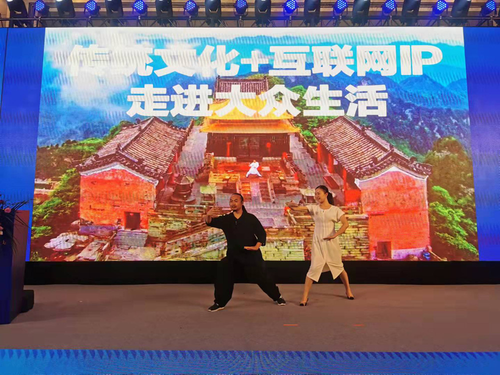 十堰市一二三文化传媒有限公司团队许微含道长上台与各行精英分享武当健康养生文化,并向大家展示了我们的道家功法。